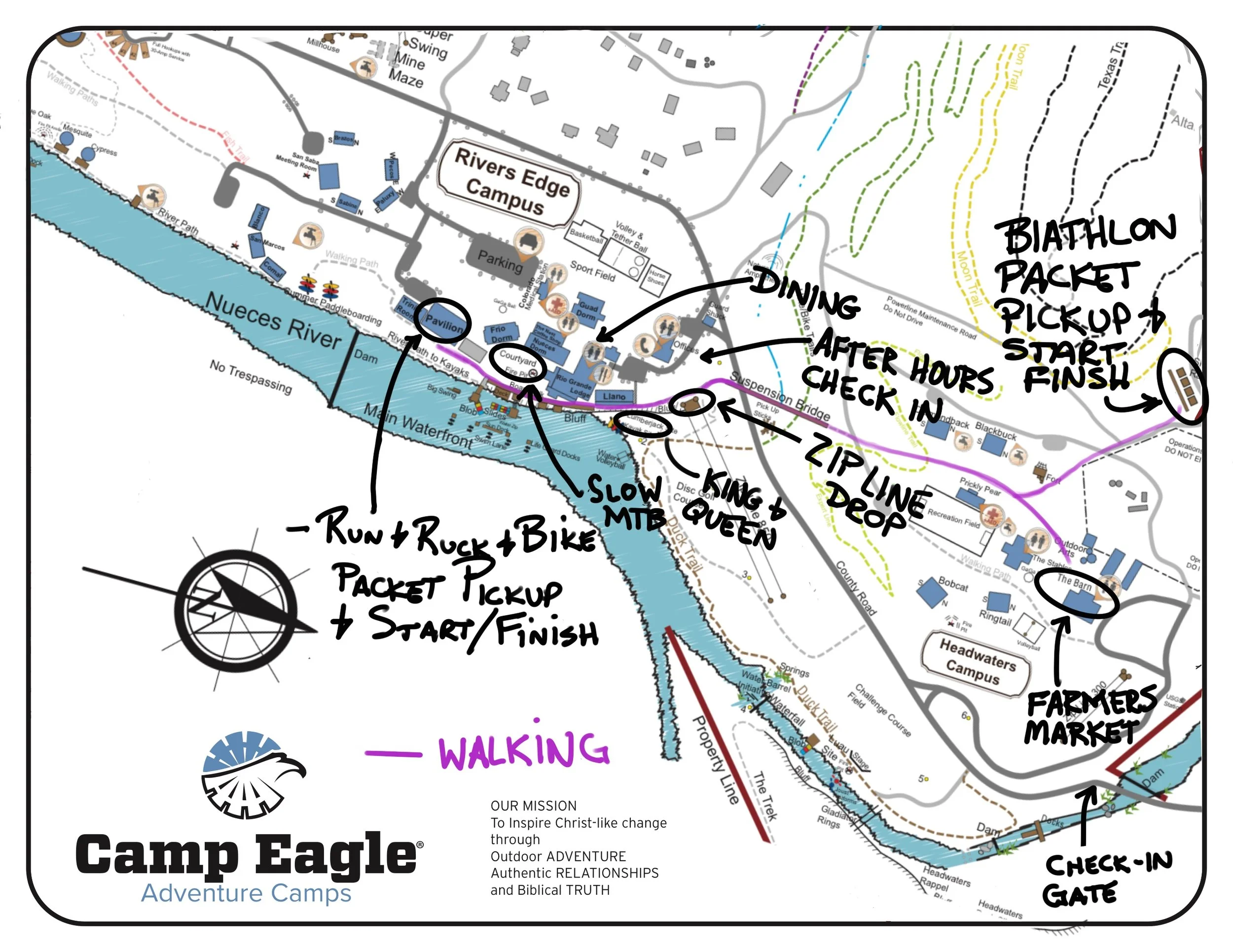 Below is a map of the Camp Eagle Campus showing where our activities will be happening. We will also have signs around campus pointing where to go and there will be a whiteboard in the pavilion for current info.