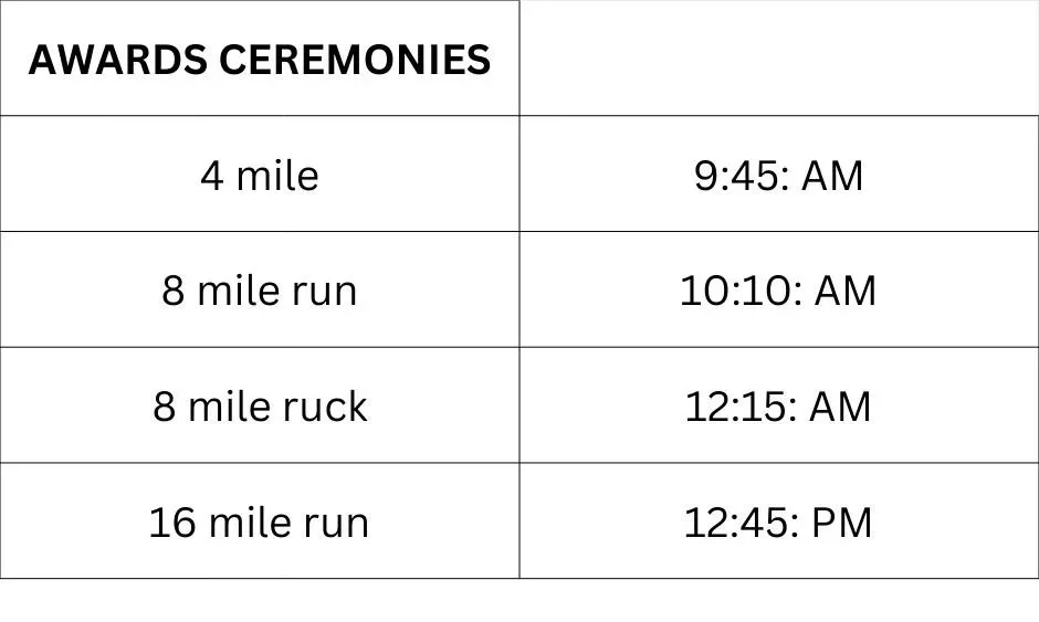 Race: 4 miles run, 8 miles run & ruck, 16 miles run, Last Person Standing Run, Last Person Standing Ruck, Youth 1 Mile