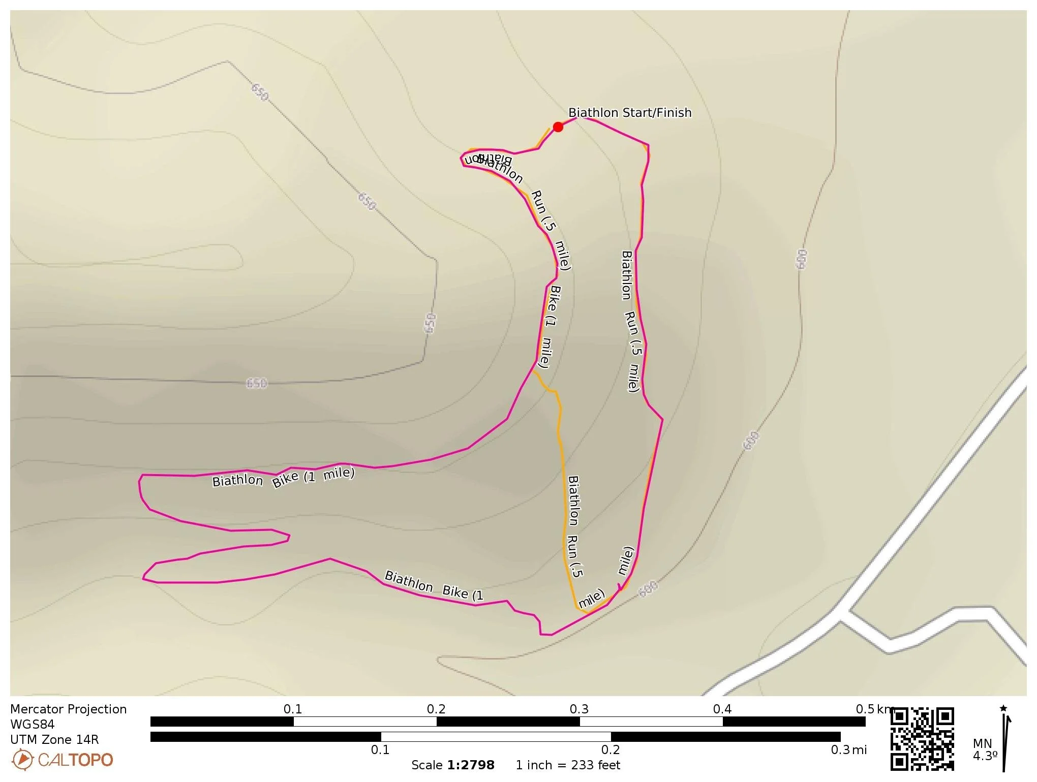 The Trail Run Biathlon will do ~1/2 mile laps. The Mountain Bike Biathlon will do ~1 mile laps.